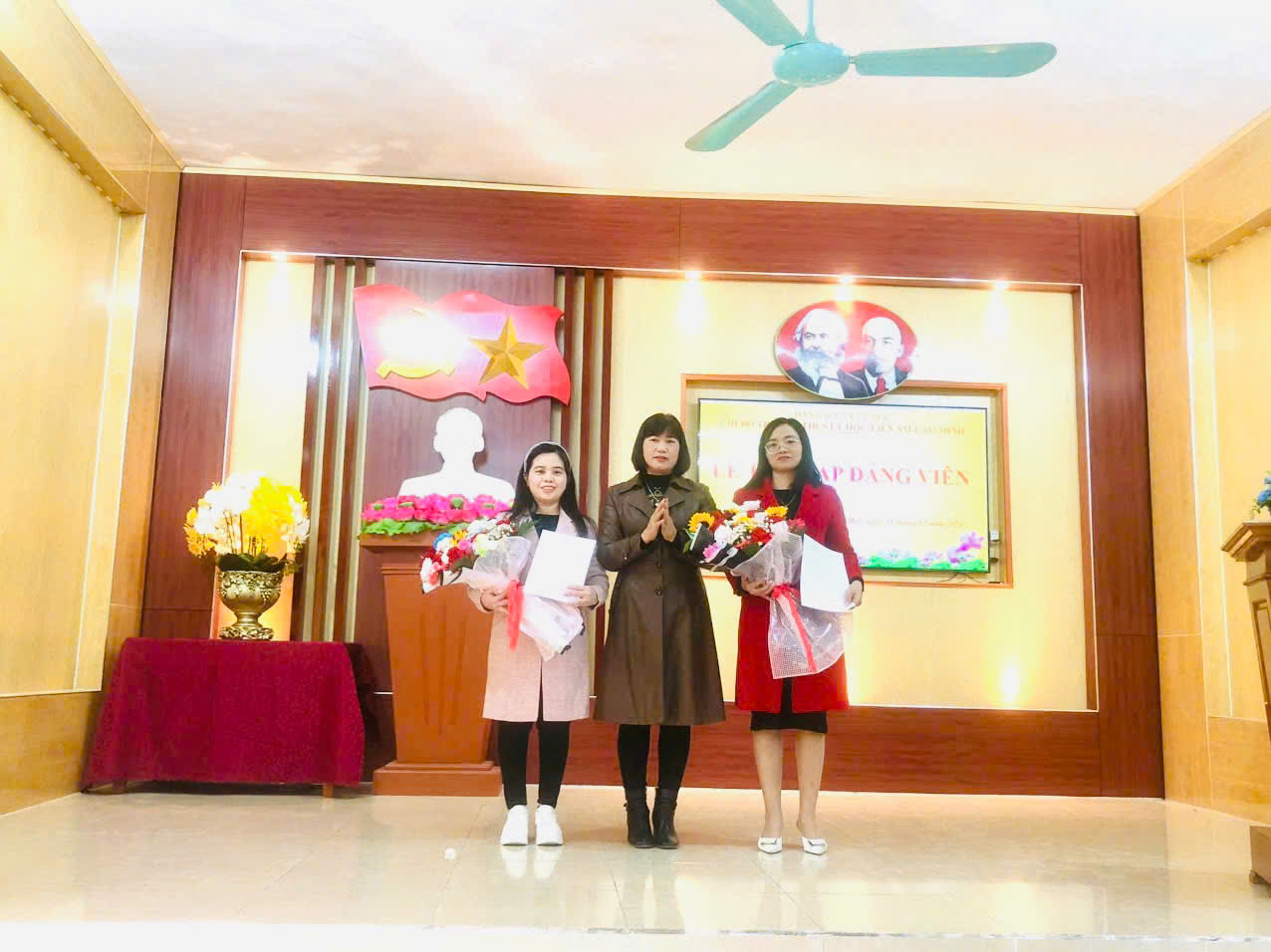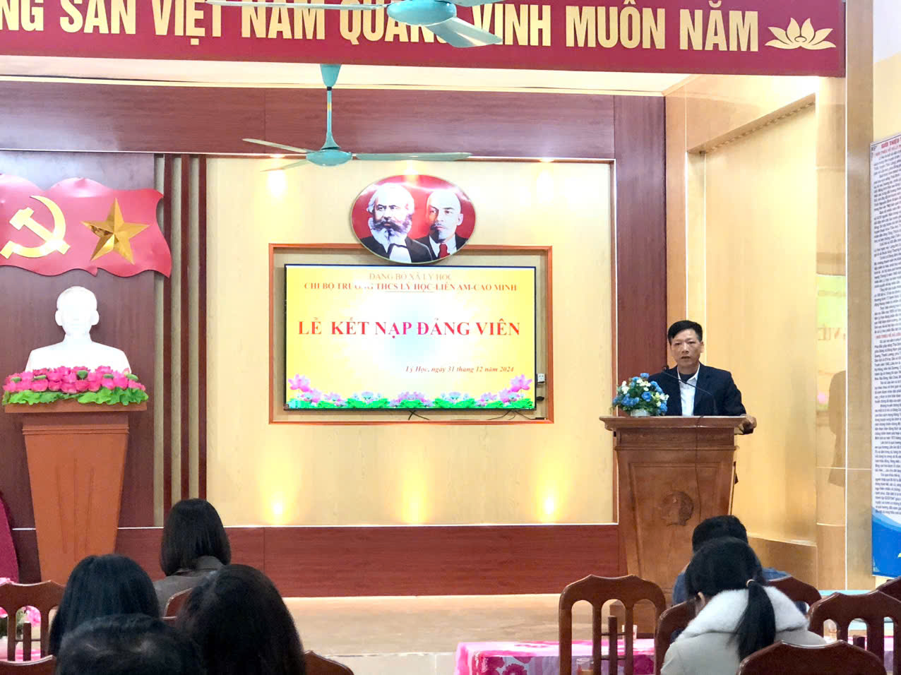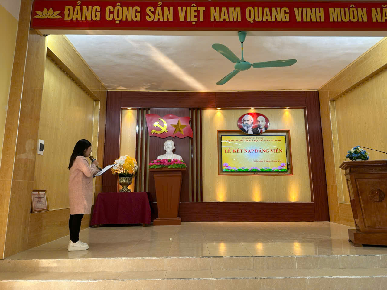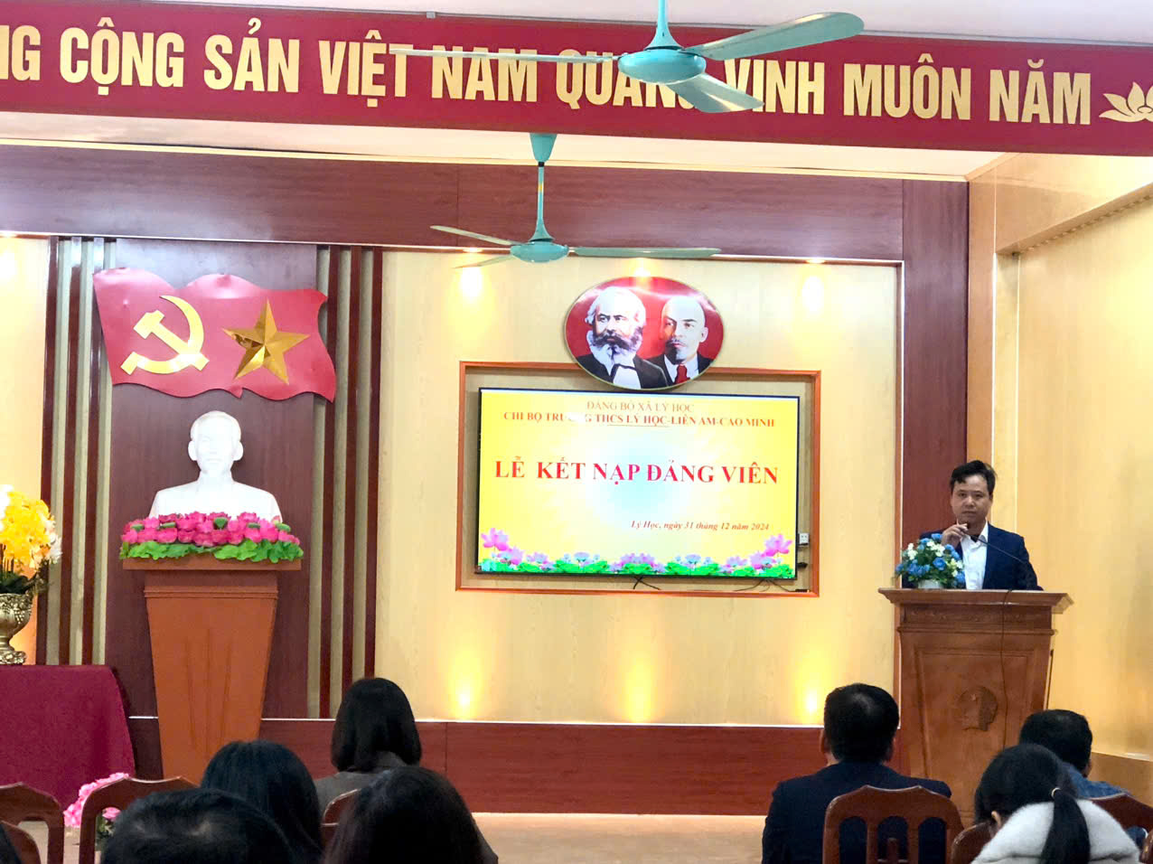 Thực hiện Quyết định số 749-QĐ/HU, ngày 16/12/2024 của Huyện ủy huyện Vĩnh Bảo về việc kết n ạp đảng viên; Chi bộ Trường THCS Lý Học-Liên Am-Cao Minh long trọng tổ chức buổi Lễ kết nạp đảng viên mới đối với 02 đồng chí Nguyễn Thị Hoàn và Nguyễn Thị Ngọc Điệp - Giáo viên trường.